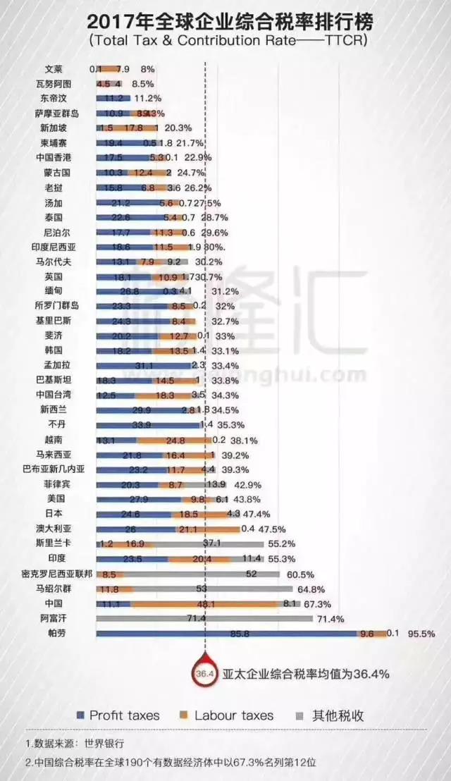 在世界銀行的定義中,總稅率是用企業(yè)減免掉法律允許部分之后必須繳納的稅額占商業(yè)利潤的比例,包括利潤稅或企業(yè)所得稅、雇主繳納的社會派款和勞務稅(包括所有強制性派款,甚至包括交付給返還型養(yǎng)老金之類的私營實體的派款)、財產(chǎn)稅、周轉(zhuǎn)稅和其它稅(如市政設施費以及車輛稅)等五類。