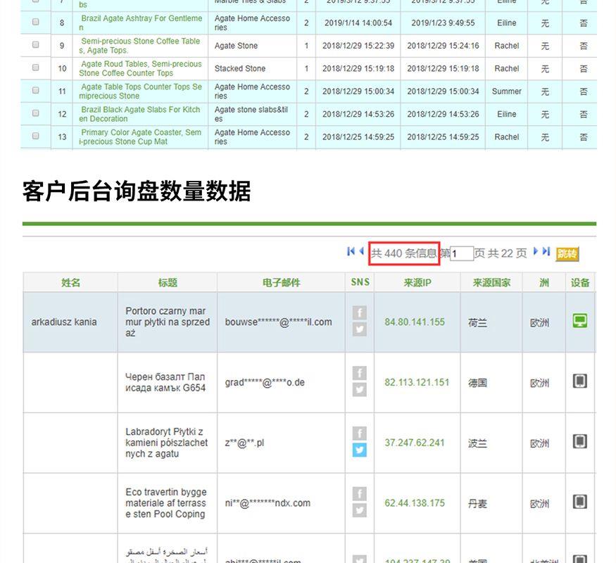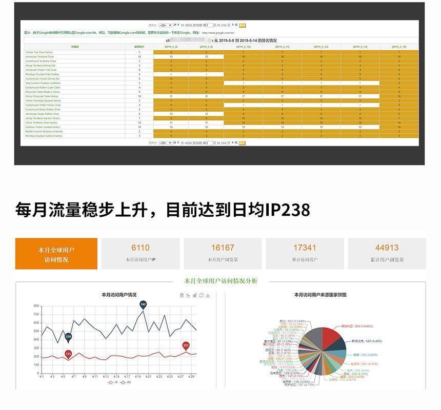 客戶(hù)自開(kāi)通外貿(mào)快車(chē)以來(lái),一直注重平臺(tái)的運(yùn)營(yíng)及維護(hù)工作,目前網(wǎng)站已發(fā)布1340個(gè)產(chǎn)品,70%以上的產(chǎn)品相似度都保持在75%以下。頁(yè)面數(shù)量多、質(zhì)量高,因此被谷歌收錄的頁(yè)面數(shù)量也多,進(jìn)而大大提升了網(wǎng)站的流量。目前網(wǎng)站日均流量高已突破300個(gè),后臺(tái)共計(jì)收到400多個(gè)詢(xún)盤(pán)(不包含客戶(hù)直接發(fā)郵件至郵箱的咨詢(xún))。